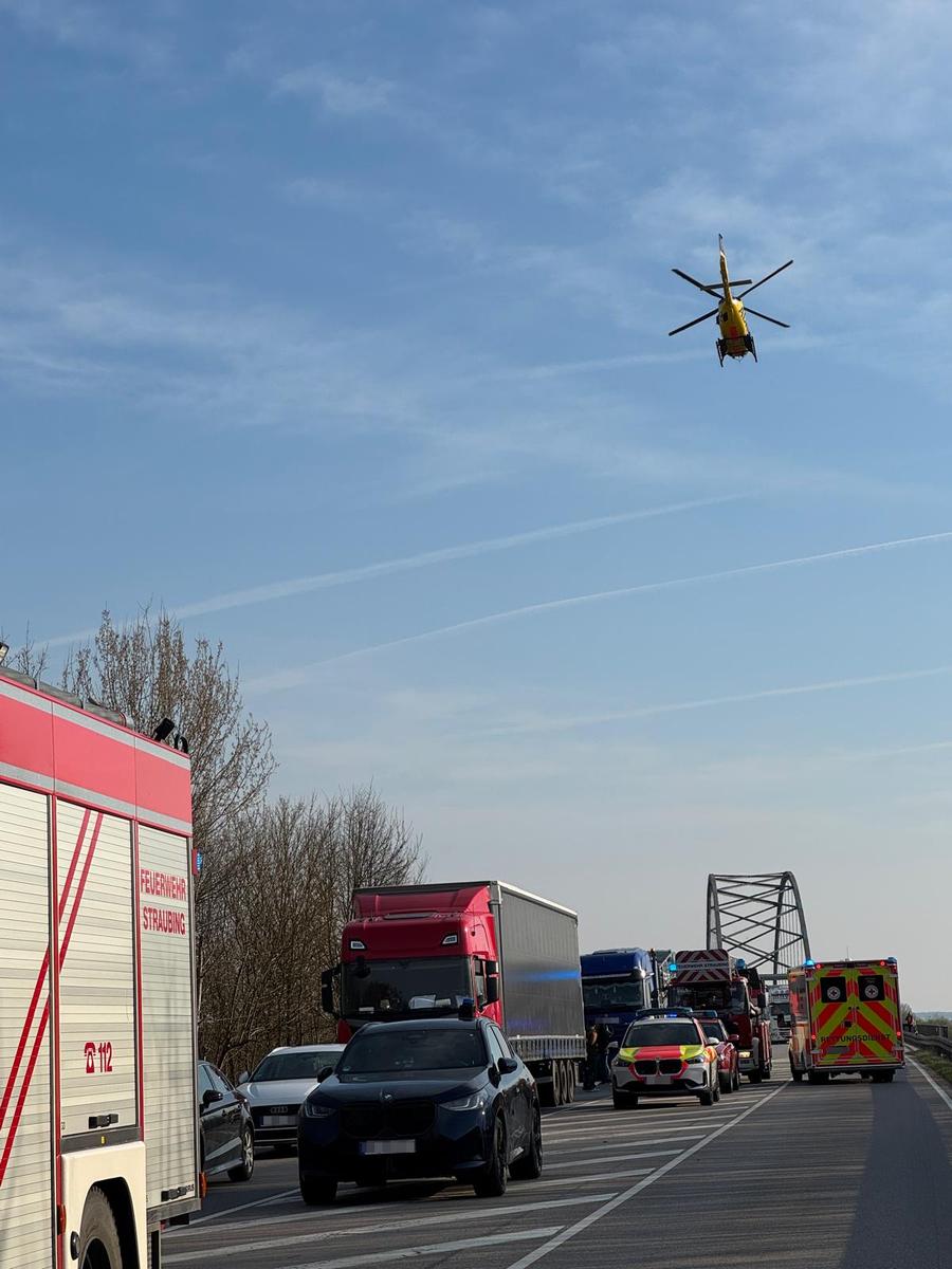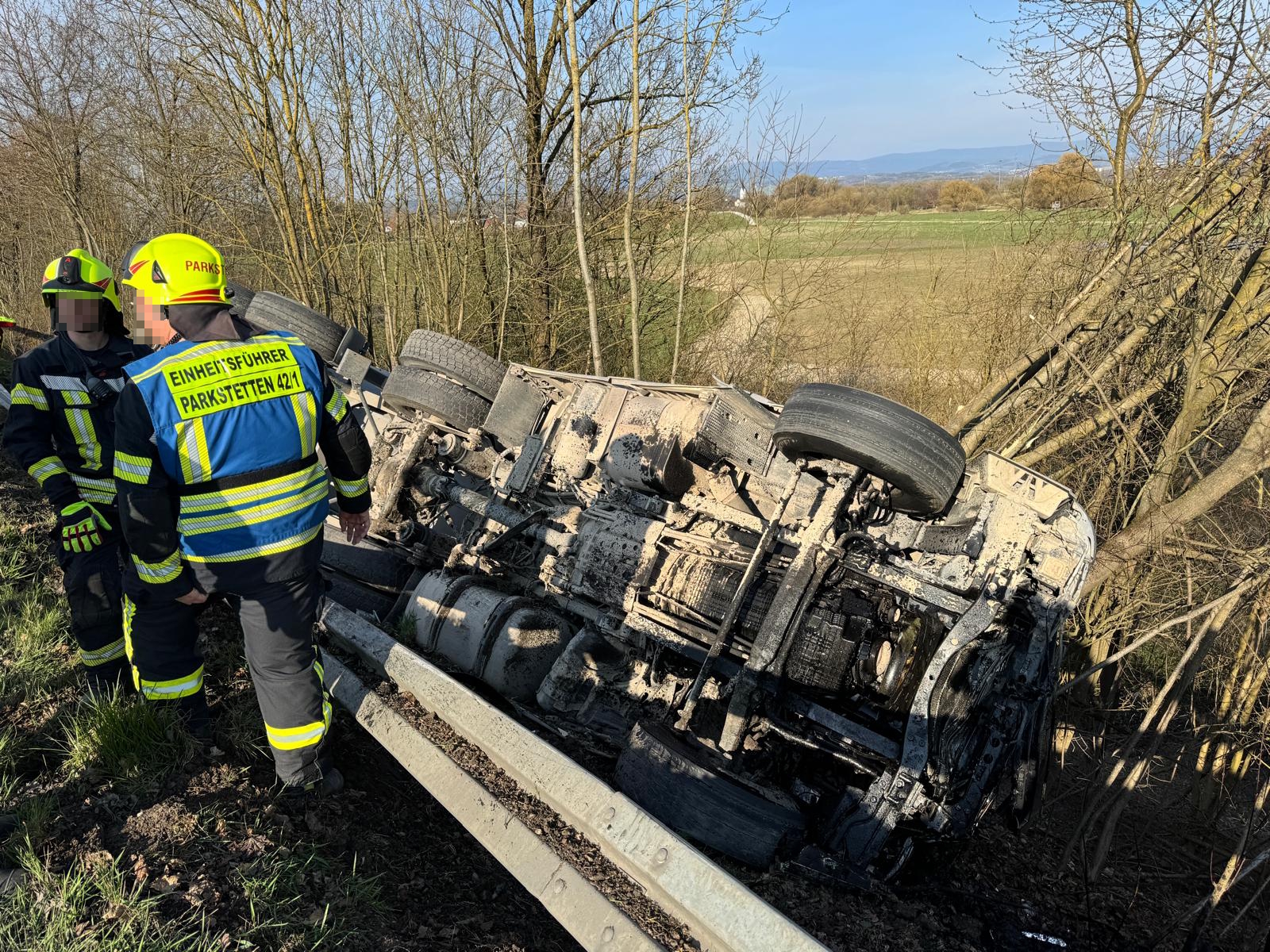 Noch während wir an der Donau im Einsatz waren, wurden wir auf einen weiteren Unfall in unmittelbarer Nähe aufmerksam. Rund 200 Meter hinter unserer bisherigen Einsatzstelle war es zu einem schweren Verkehrsunfall zwischen einem LKW und einem PKW gekommen.