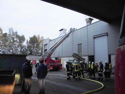 Aufgrund der abgekapselten Anlage stellte sich die Brandbekämpfung als äußert schwierig dar. Die Feuerwehr Bogen startete sofort den Erstangriff mit der Drehleiter über das Hallendach. Die Löschwasserversorgung erfolgte über zwei B-Leitungen aus dem örtlichen Hydrantennetz.